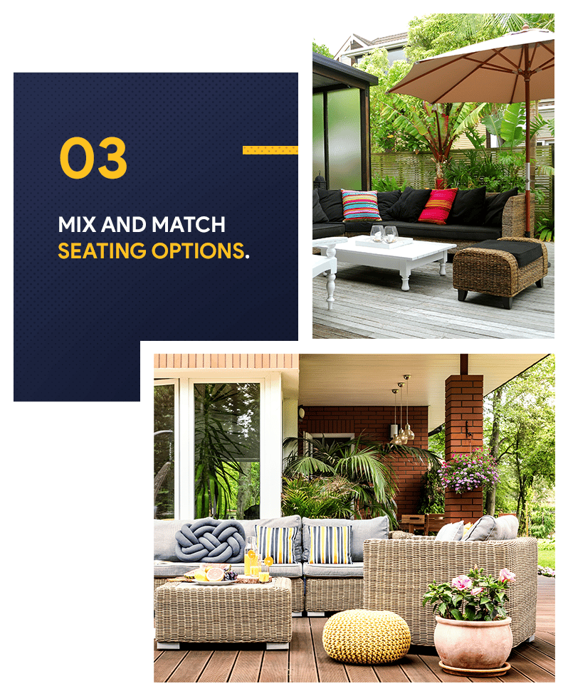 You’ve got more choices than ever, and everything could potentially add some style to your patio. It’s also great if you love collecting individual pieces of furniture or if you just want a homey, vintage look. Just make sure to arrange the pieces and patterns in a way that they won’t look cluttered.