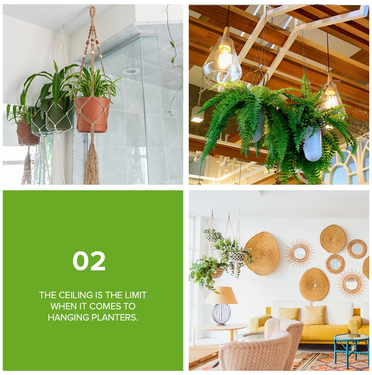Love plants but don't think you have any extra floor space? Well, the sky (or the ceiling) is the limit! Creating a garden in the air can instantly add a dreamy, bohemian look in your space. Also, setting up hanging planters at varying heights is an unexpected way to add color and visual interest. Hanging plants are also perfect if you have pets or small children and you’re afraid of them grabbing the plants on the floor or tabletop, especially since there are some plant varieties that could be poisonous to them when eaten.