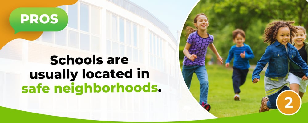 Schools prioritize safety. Many schools have tight security measures around their campuses. Police and local law enforcement also have a more active presence near schools and surrounding neighborhoods. If you're a home buyer who is looking for a safe community, living near a school or within a school district can be beneficial for you. Of course, this might not apply to every single community, so don’t forget to check the local crime maps to verify information about neighborhood safety in general.