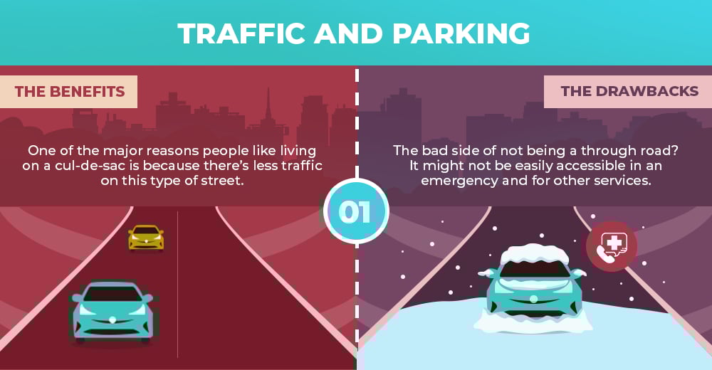 The benefits: One of the major reasons people like living on a cul-de-sac is because there's less traffic on this type of street. Because unless you live in one of the houses on the block, the only reason you could be in there is if you’re visiting someone who lives on that street, or you’re lost.